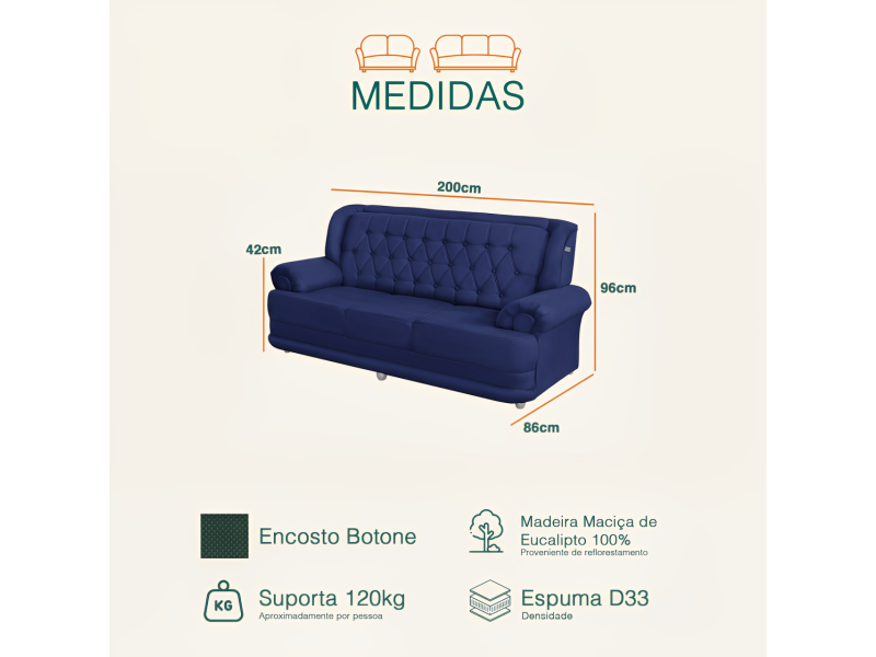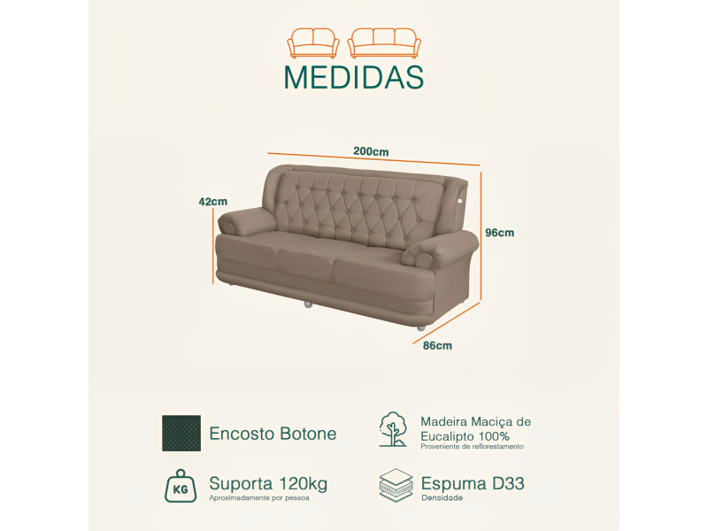 Largura aproximada 3 lugares: 200cm (esquerda/direita)