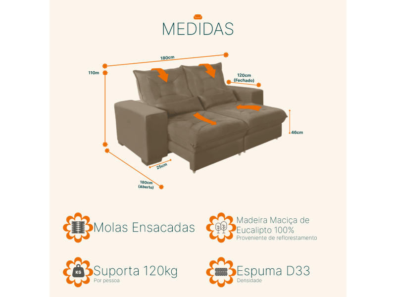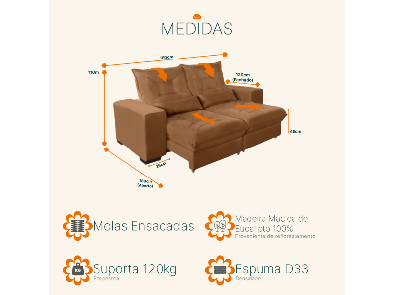 Não para por aí: seu assento retrátil conta com espuma D33 e molas ensacadas, transformando seu sofá em uma verdadeira cama para assistir seus esporte/series/filmes favoritos. Seu sonho a um click de distância!