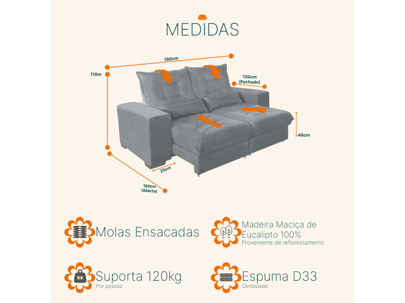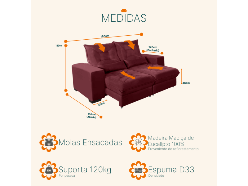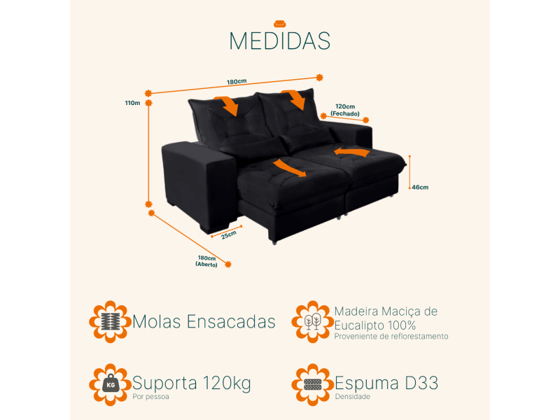 - retrátil com SUPER PILLOW TOP de espuma D33 e sistema de molas ensacadas individualmente, com até 240 molas por assento. corrediça de aço galvanizado , trazendo maior segurança e facilidade na abertura/fechamento.